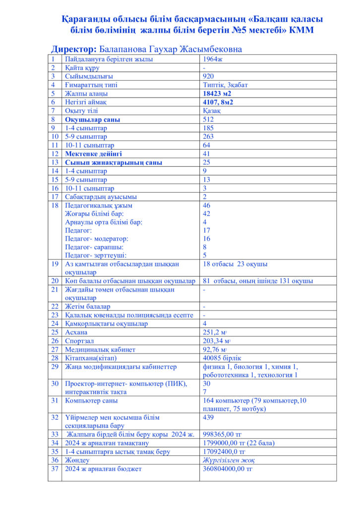 Балқаш қаласы білім бөлімінің "№ 5 жалпы білім беретін мектебі" КММ